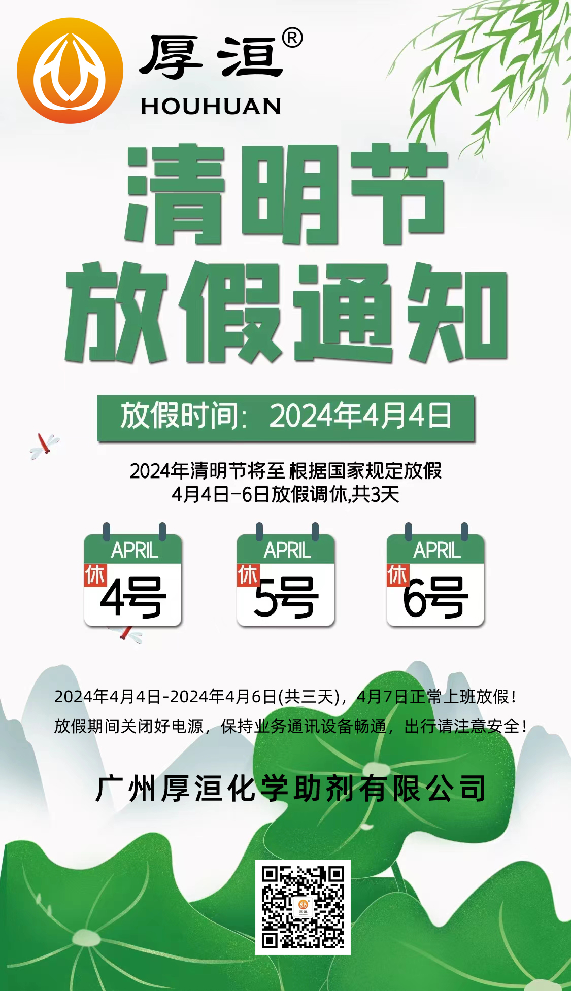節(jié)假日期間,請(qǐng)各部門(mén)要妥善安排好值班和安全、保衛(wèi)、業(yè)務(wù)處理等工作,最后厚洹化學(xué)祝全體員工愉快度過(guò)清明小假期,出行注意安全,文明祭掃,準(zhǔn)時(shí)安全返崗。