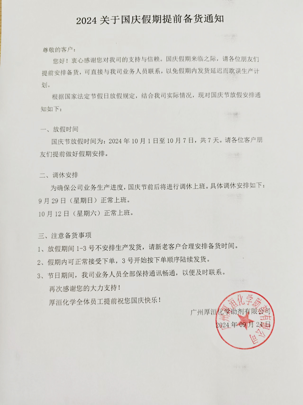 請(qǐng)各客戶(hù)提前備好庫(kù)存,以免耽誤生產(chǎn)。假期安排給貴司工作帶來(lái)不便,敬請(qǐng)諒解!